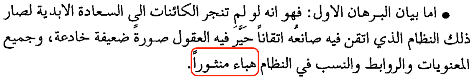 “Birinci Burhanın beyanına gelince: Eğer kâinat ebedi saadeti netice vermezse, Saniin akılları hayrette bırakır bir şekilde mükemmel yaptığı şu nizam zayıf ve aldatıcı bir sûrete döner, nizamdaki bütün maneviyat, rabıtalar ve nisbetler heba mensur olur, boşa gider.”