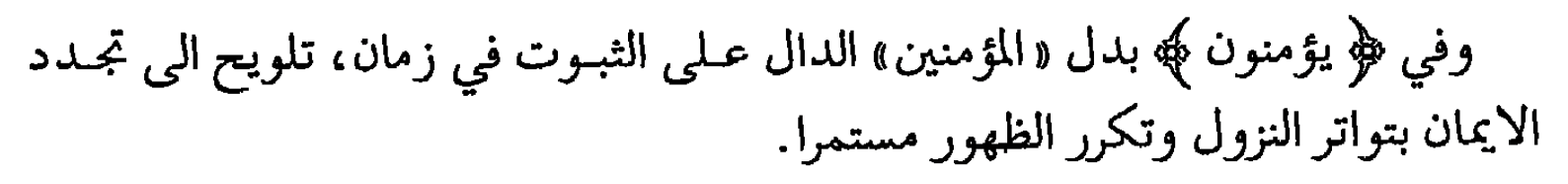 Şadi Eren tercümesi (sayfa 66): “İsim olarak bir zamanda sübûta delâlet eden “mü’minûn” denilmeyip fiil olarak يُؤْمِنُونَ ‘iman ederler’ denilmesi, imanın ardarda inen ayetlerle yenilenmesine ve devamlı olarak zuhurunun tekerrürüne bir telvihtir.”