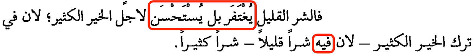 Bu konuyla ilgili sorulabilecek bir başka soru da, yukarıdaki açıklamanın apolojetik olup olmadığı. Zira sanki birbirinden bağımsız şerr-i kalil ve hayr-ı kesir var da, ikincisi hatırına birinciyi mazur görmemiz bize salık veriliyor gibi. Nitekim bu parçanın çalışıldığı derste Muhammed Ali Asıl böyle bir soru sormuş ve Yunus Orhan müellifin konuyu hayatının ilerleyen safhalarında daha üst seviyede açıkladığını söylemiş. Müellif konuyu daha sonraki eserlerinde daha tafsilatlı anlatsa da, daha üst seviyede anlatmıyor. O anlatıların hepsi dikkatinize sunduğum cümlenin içinde özet halinde mevcut. Bunu görmek için öncelikle metnin Arapça orijinalini (sayfa 35) dikkate alalım: