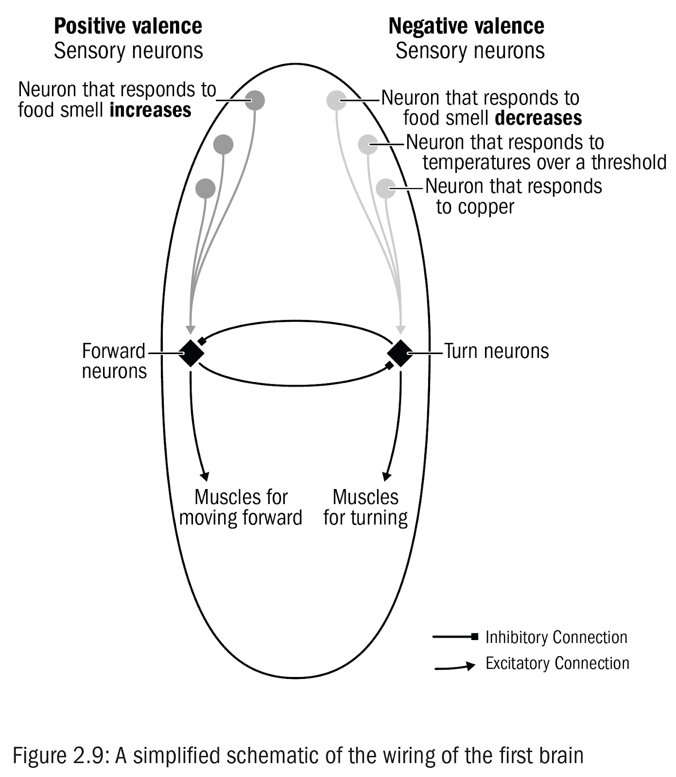 Varlığın artmasının ve azalmasının iki ayrı derdi netice vermesinin bir kasıt üzere olduğunun izleri sinir sisteminin yapısında bile görülebiliyor. Mesela aşağıdaki şemaya göre [1] en basit bir beyinde bile varlığın artışını kodlayan nöronlarla azalışını kodlayan nöronlar birbirinden farklı: